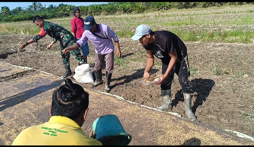 Guna mendukung ketahanan pangan wilayah Babinsa Pusaka Koramil 03/Tebas Kopda Jumari membantu petani menyemai benih padi yang akan di tanam di persawahan yang berada di Dusun Sekadim, Desa Pusaka, Kecamatan Tebas, Kabupaten Sambas, Sabtu (17/05/2025).