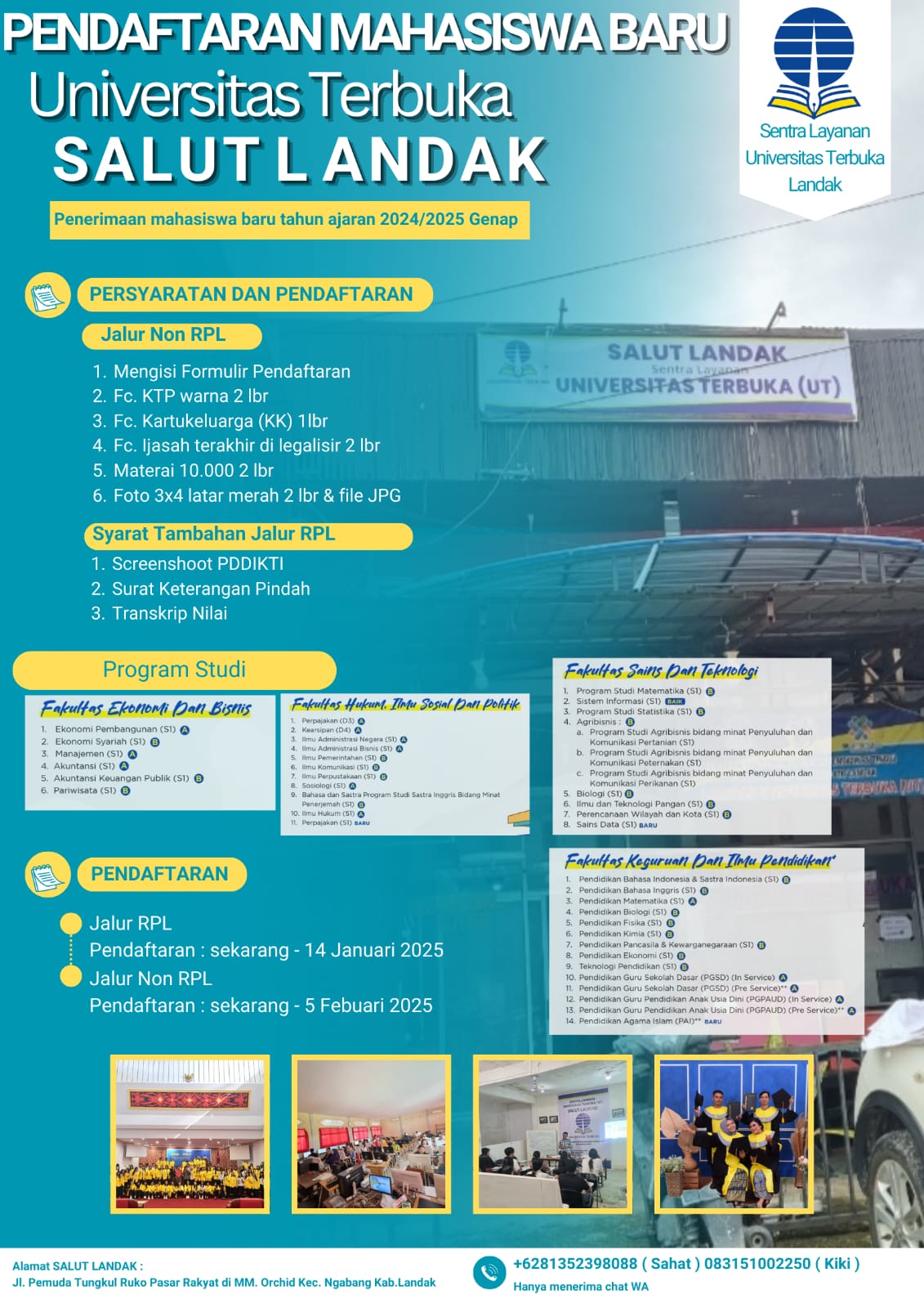 Universitas Terbuka (UT) Salut Landak masih membuka pendaftaran mahasiswa baru hingga Februari 2025. Bagi calon mahasiswa baru yang ingin melanjutkan studi melalui jalur Rekognisi Pembelajaran Lampau (RPL) atau alih kredit, pendaftaran dapat dilakukan hingga 12 Januari 2025.