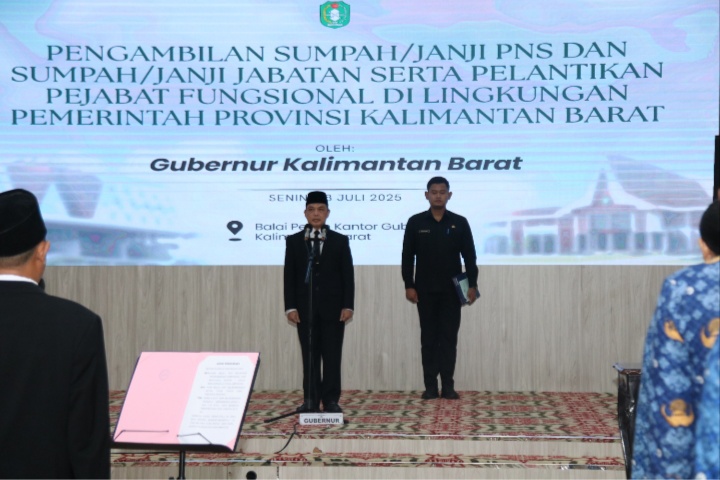 Gubernur Kalimantan Barat, Drs. H. Ria Norsan, M.M., M.H. resmi melantik 50 Orang ASN dalam jabatan fungsional dan 33 Orang yang mengikuti pengambilan Sumpah/Janji ASN di Balai Petitih Kantor Gubernur Kalimantan Barat, Senin (28/7/2025).