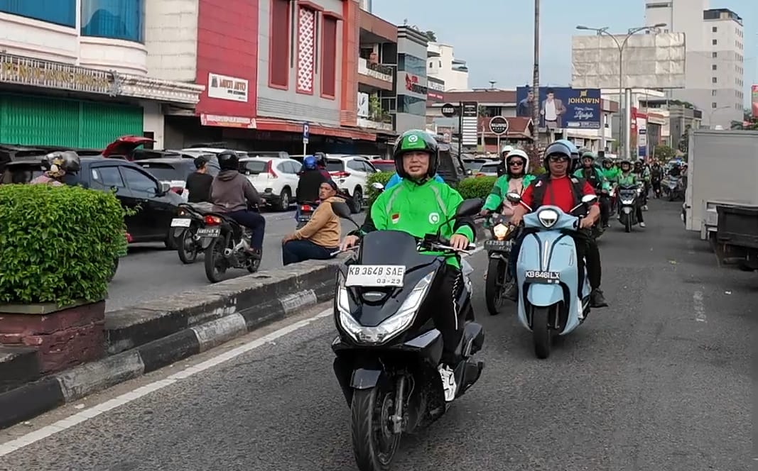 Norsan yang mengenakan jaket driver, konvoi mengendarai sepeda motor ditemani ratusan ojek online (ojol). Kedatangan Norsan disambut antusias ratusan pedagang dan masyarakat.