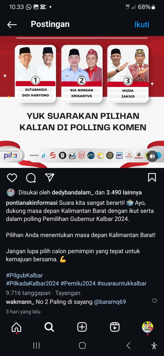 Pontianak Informasi sendiri, merupakan akun media sosial instagram yang memiliki sebanyak 507 ribu follower atau pengikut. Sejauh ini, PI menjadi media sosial interaktif terbesar di Kalbar. (MB)