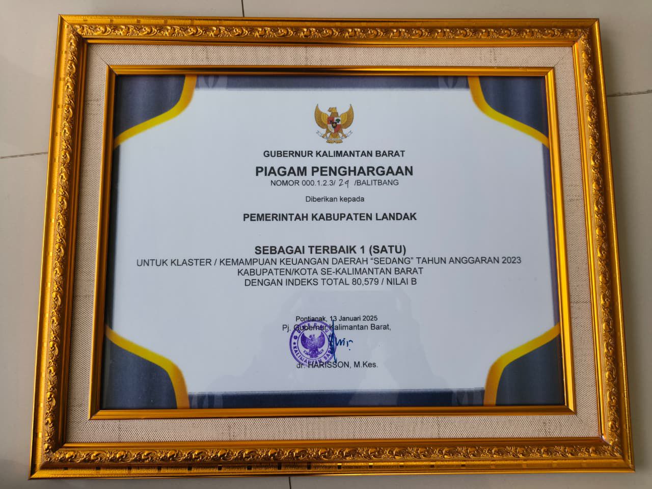 Majalahmataborneonews.com,Landak – Pemerintah Kabupaten Landak menerima penghargaan dari Gubernur Kalimantan Barat dalam pengukuran Indeks Pengelolaan Keuangan Daerah (IPKD) tahun anggaran 2023 tahun ukur 2024 menjadi yang terbaik pada kategori kapasitas fiskal sedang di provinsi Kalimantan Barat dengan indeks 80,579.