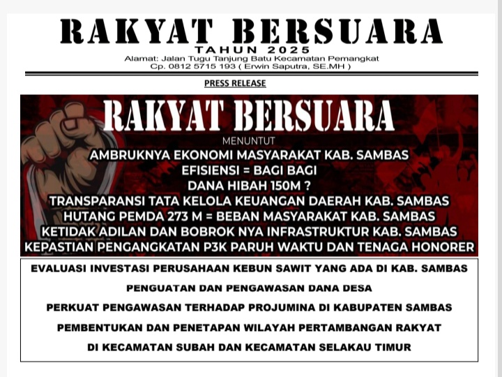 Rakyat Bersuara Kabupaten Sambas akan menggelar aksi damai pada tanggal 23 September 2025, dengan tujuan menuntut Bupati dan DPRD Kabupaten Sambas untuk meningkatkan transparansi dan keadilan dalam pengelolaan keuangan daerah.