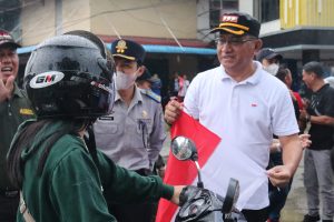 Pj. Bupati Landak Kibarkan dan Bagikan Bendera Merah Putih di Tugu Pahlawan Ngabang