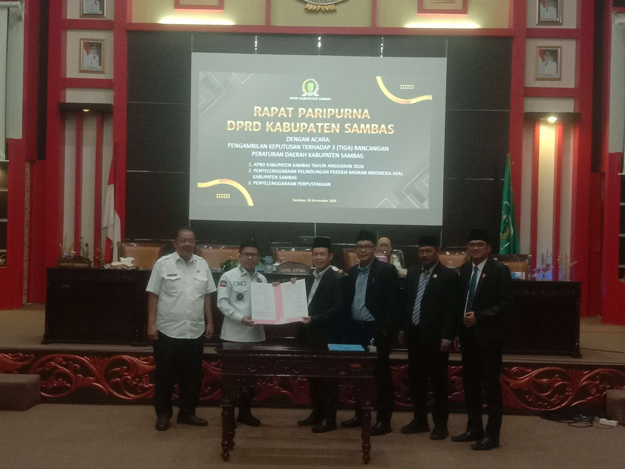 Dewan Perwakilan Rakyat Daerah (DPRD) Kabupaten Sambas resmi mengesahkan tiga Rancangan Peraturan Daerah (Raperda) dalam Rapat Paripurna yang digelar di Gedung DPRD Sambas. Tiga regulasi yang disahkan tersebut meliputi Raperda tentang APBD Kabupaten Sambas Tahun Anggaran 2026, Raperda tentang Penyelenggaraan Perlindungan Pekerja Migran Indonesia (PMI) Asal Kabupaten Sambas, serta Raperda tentang Penyelenggaraan Perpustakaan.