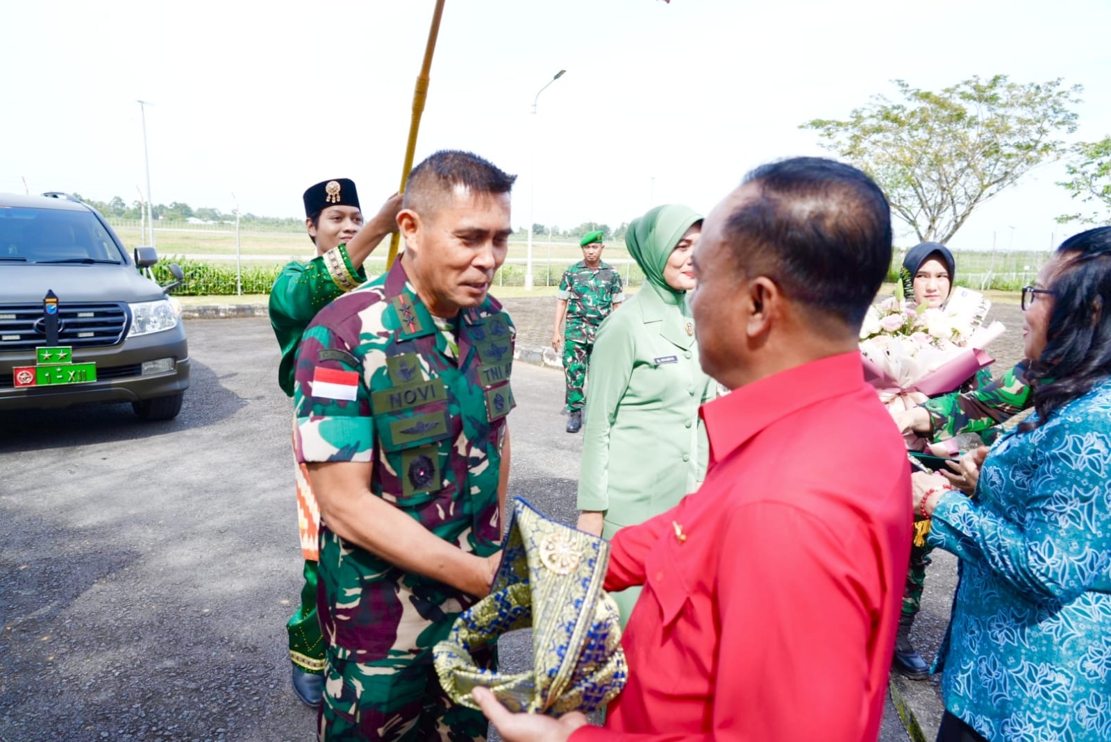 Setibanya di bandara, Mayjen TNI Novi Rubadi Sugito beserta istri disambut dengan tarian khas Melayu dan prosesi adat Tepung Tawar sebagai simbol penghormatan kepada tamu kehormatan. Penyambutan dilanjutkan dengan pemasangan Tanjak dan pengalungan syal oleh Wagub Krisantus sebagai wujud keramahtamahan masyarakat Kalimantan Barat.
